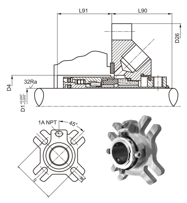• Four-bolt gland accurately sets the seal axially and radially.